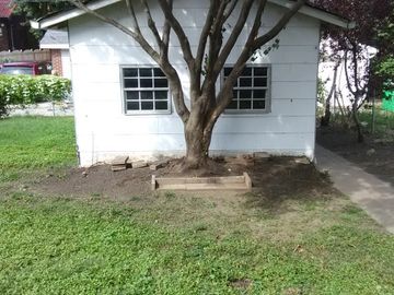 Bringing new life to an exsiting garden that was over run with weeds. Around the tree, rotten landscape timbers were removed and stones found buried, found new life when placed as a border for mulch retention.